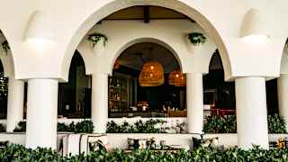 Outdoor restaurant seating area with white arches, columns, green plants, and hanging wicker lamps, offering a cosy and elegant atmosphere. Tables and chairs are arranged neatly behind a hedge. View image, opens in a dialog