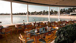 Open-air restaurant with wooden tables and chairs overlooking a sandy beach and calm sea. Palm trees and sun loungers are visible in the background along the shoreline under a bright, partly cloudy sky. View image, opens in a dialog