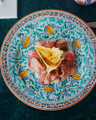 A colourful, ornate plate with a slice of yellow omelette on top of a pile of thinly sliced ham, set on a dark green table. View image, opens in a dialog