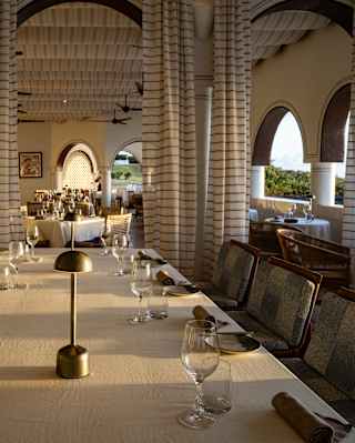 A row of circular tables on a curved restaurant terrace over the beach View image, opens in a dialog