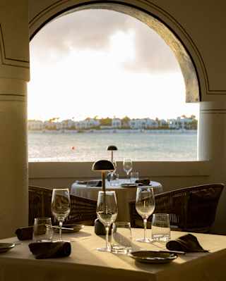 At sunset, guests mingle among candle-lit tables on Cip's terrace, enjoying views of the bay and a grand sailing yacht. View image, opens in a dialog