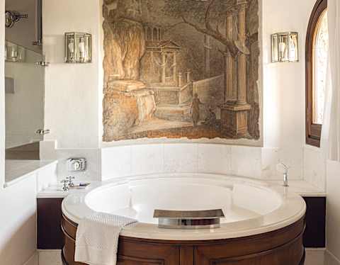 This bath channels the grandeur of the Renaissance. A circular tub sits beneath striking artwork, creating a focal point that feels both dramatic and serene. Marble surfaces add cool elegance, while views over the Amalfi Coast and Tyrrhenian Sea bring warmth and light.
