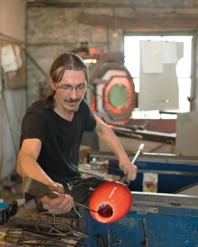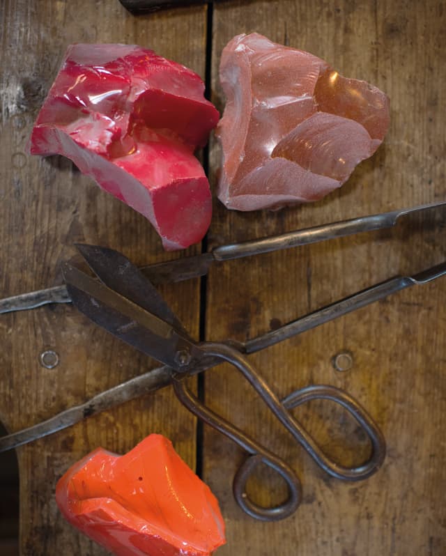 His boutique is an Aladdin’s Cave of multi-coloured vases, lamps and artwork. The adjacent workroom is a whole other world; a den of raw products and barbarous-looking tools, dominated by the glowing central furnace. It’s temperature is kept between 1000°C and 1500°C.