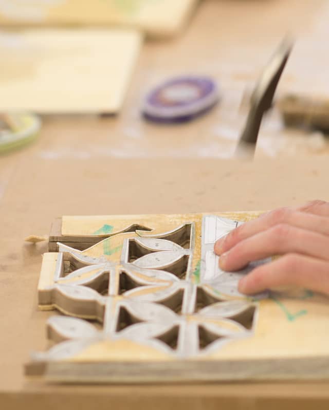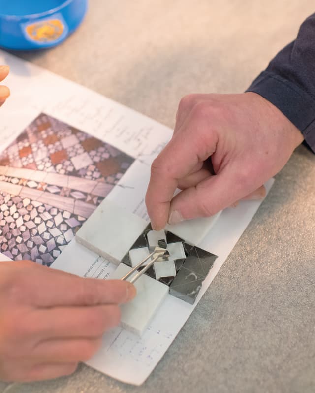 Compared to the spectacle of the glassblowing workshop, Jérôme’s work is marked by finesse and precision. There are no wrought iron pincers or roaring flames; one of his most precious tools is a gleaming, delicate pair of tweezers. Materials including marble, onyx, Venetian granite and Italian glass are cut to unfathomably precise small sizes called ‘tessels’. Then Jérôme carefully works them into the template he has drawn, adding them upside down in a method called ‘indirecte’. When he is happy, they are placed and sealed to make them strong and water tight.